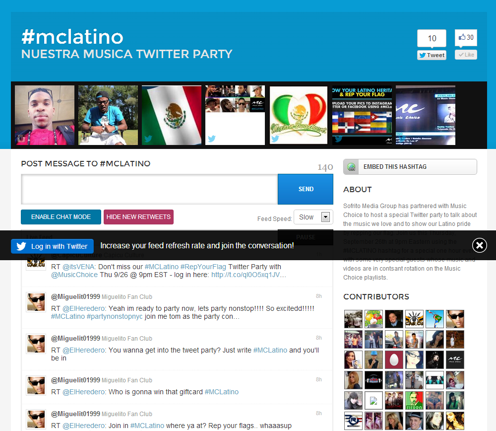 You can now chat in the provided chat interface, and keep up with the conversation by replying and retweeting all from the same page. This will filter out everything else on Twitter for the duration of the party. (do not worry… once you go back to your regular twitter client, all of your messages will be there.) The #MCLatino hashtag is automatically added to your tweets